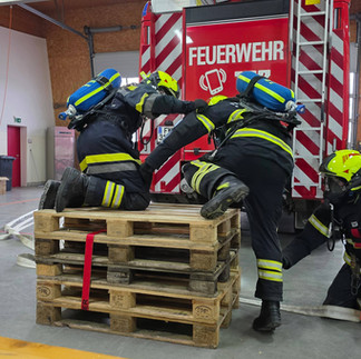 hierbei muss der Atemschutztrupp mit einer Löschleitung eine definierte Hindernisstrecke überwinden. Dabei wird speziell auf die gegenseitige Unterstützung beim Überqueren der Hindernisse geachtet